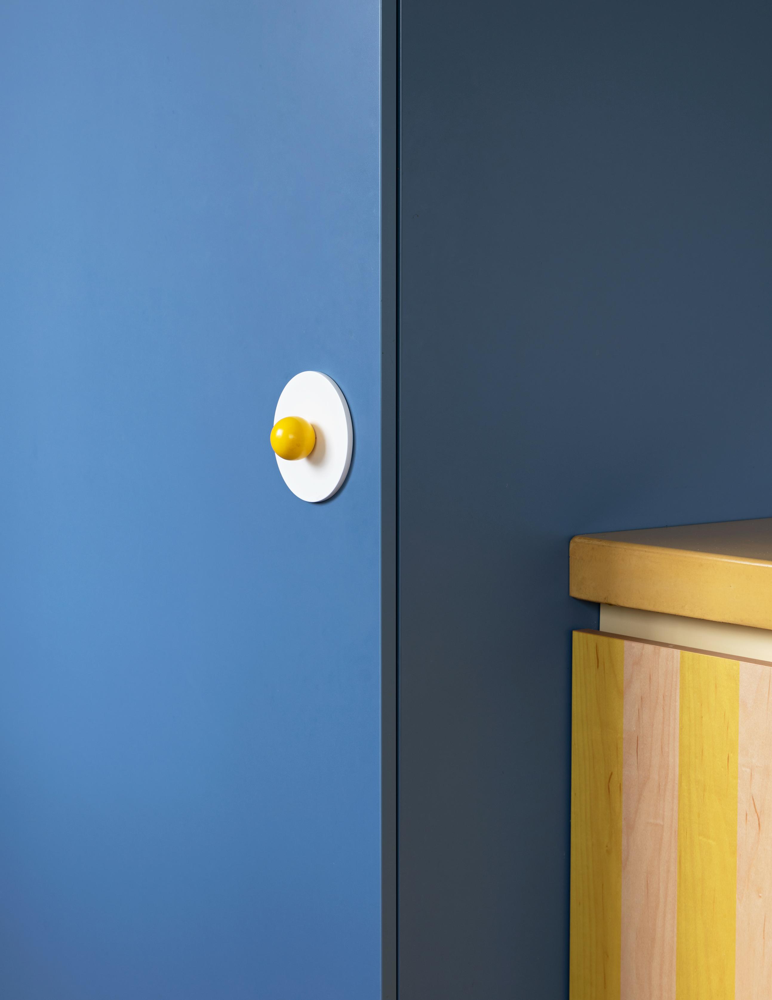 La cuisine elle-même a été divisée en quatre grands blocs. Il y a un grand volume carrelé en blanc, rassemblant l’évier et le lave-vaisselle, auquel fait face un espace de cuisson habillé de jaune avec un plan de travail en béton jaune et une hotte aspirante en miroir. Un peu plus loin, un haut volume bleu abrite le gigantesque réfrigérateur et une étagère pour les livres de cuisine, rehaussée de quelques décorations. Tout au fond, dans les placards rouges, se trouvent un cellier - un coin café - et la porte menant à la cave.
