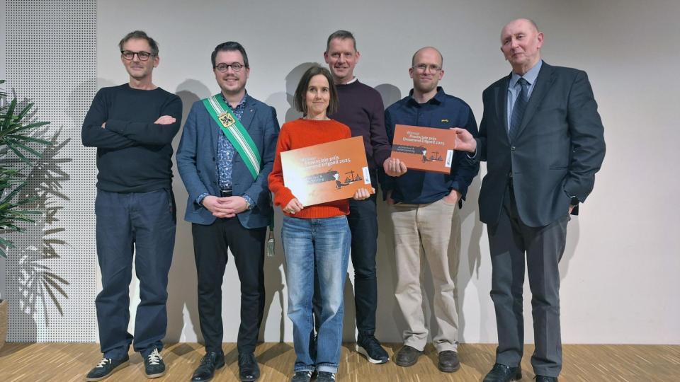 De Ringelwikke in Ronse - bouwheer en architect krijgen prijs van gedeputeerde David Coppens