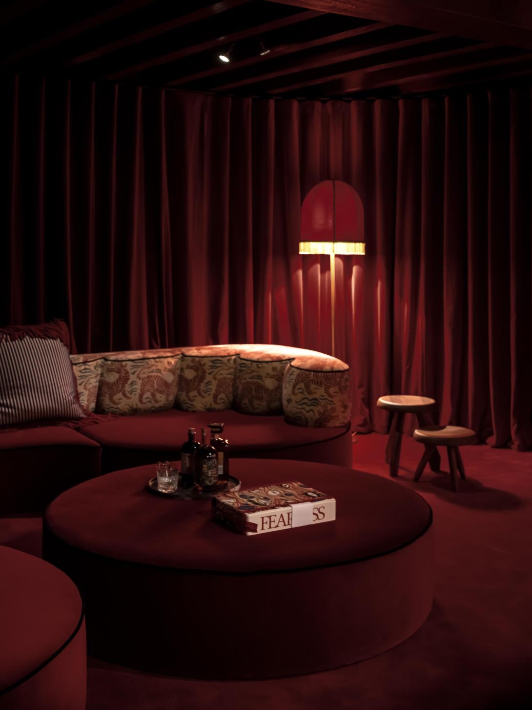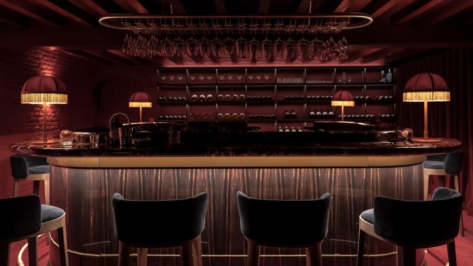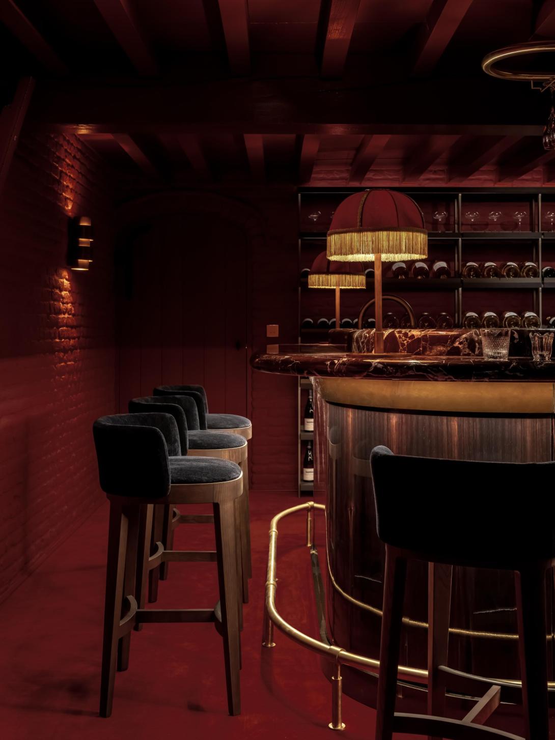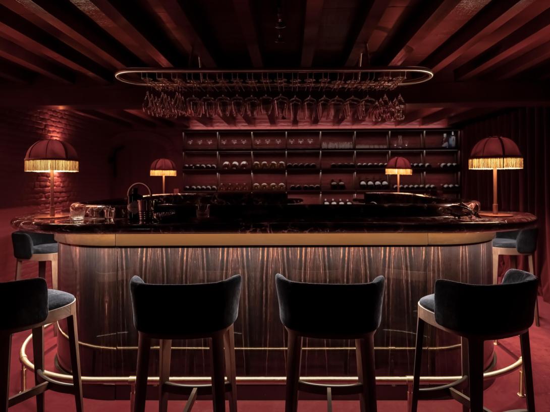 Op vraag van de bouwheer werd de kelder omgevormd tot een nachtclub met een Parijse cabaretsfeer. De architecten dompelden de ruimte onder in een rijk, monochroom rood palet. Het centrale pronkstuk is de bar, waar een marmeren werkblad harmonieus samengaat met hoogglanzend tropisch amarahout. De rode sofa, uitgevoerd door Collett & Victor volgens een ontwerp van Jean-Philippe Demeyer, roept de sfeer van het Parijs van de jaren twintig op en versterkt zo de theatrale beleving van de ruimte.
