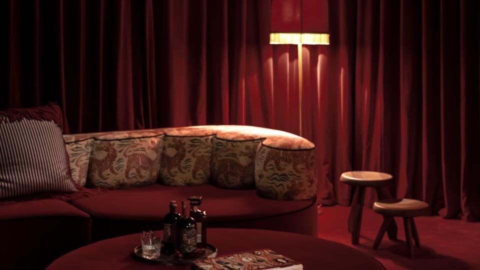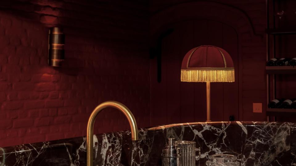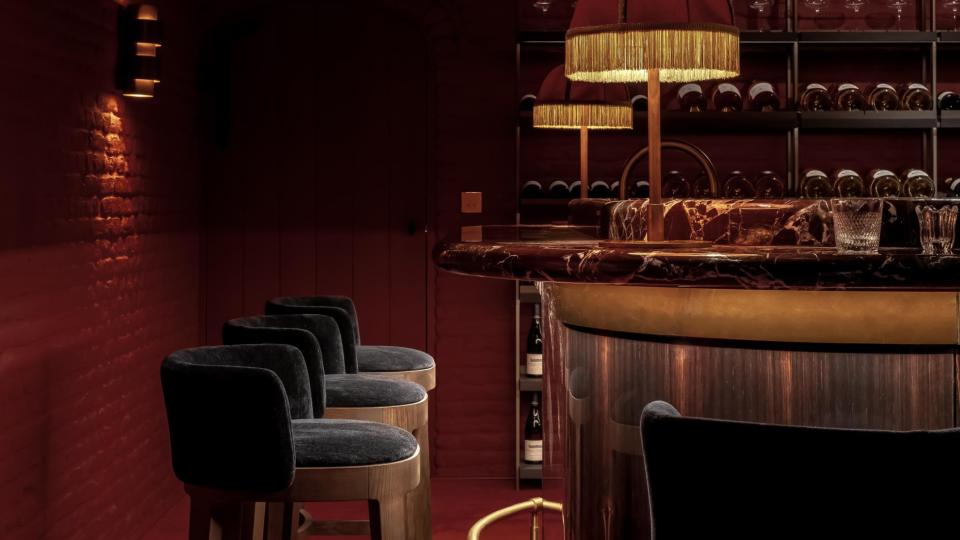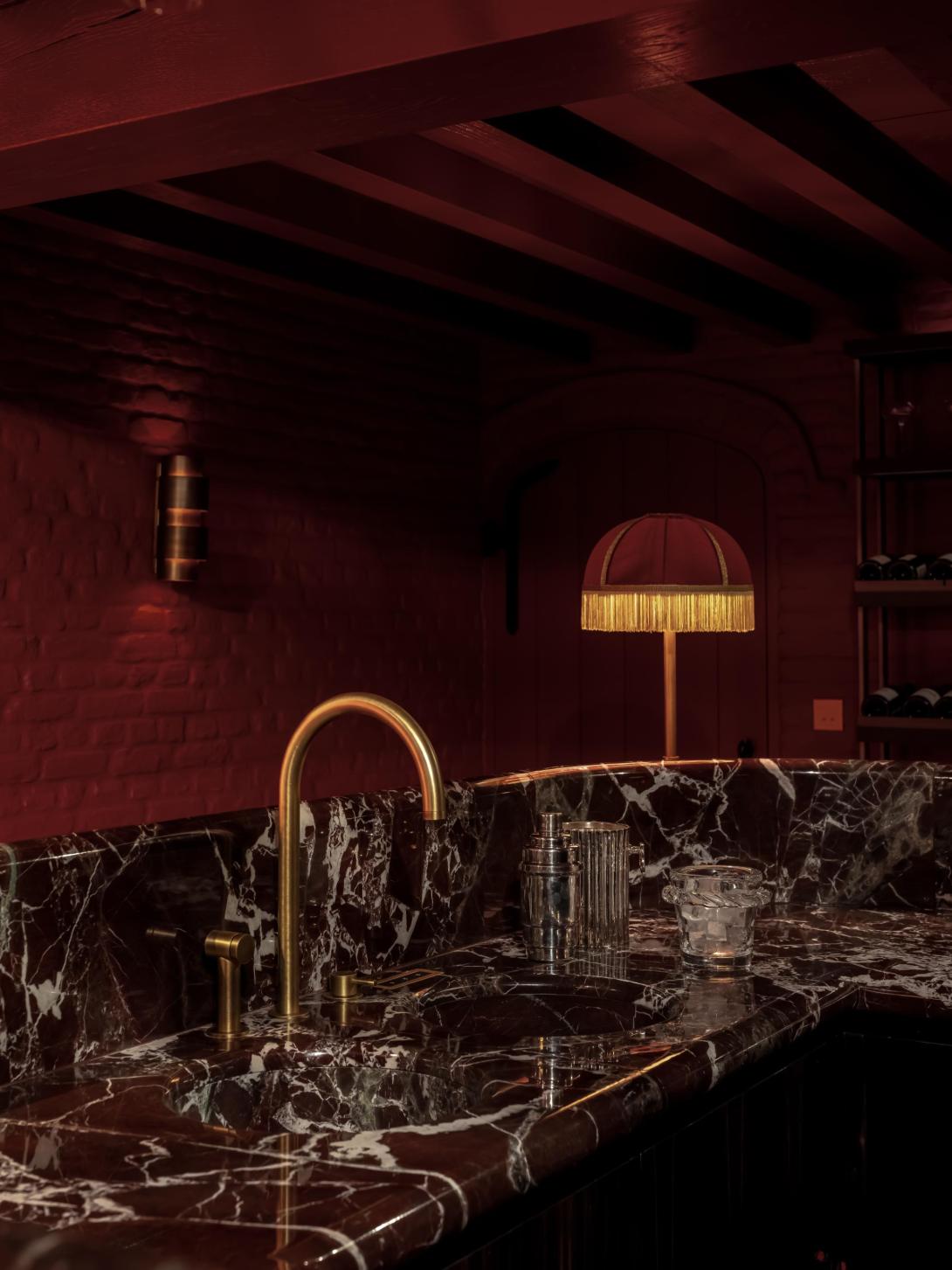 Op vraag van de bouwheer werd de kelder omgevormd tot een nachtclub met een Parijse cabaretsfeer. De architecten dompelden de ruimte onder in een rijk, monochroom rood palet. Het centrale pronkstuk is de bar, waar een marmeren werkblad harmonieus samengaat met hoogglanzend tropisch amarahout. De rode sofa, uitgevoerd door Collett & Victor volgens een ontwerp van Jean-Philippe Demeyer, roept de sfeer van het Parijs van de jaren twintig op en versterkt zo de theatrale beleving van de ruimte.