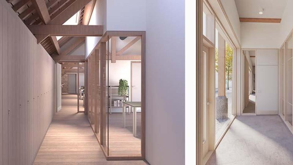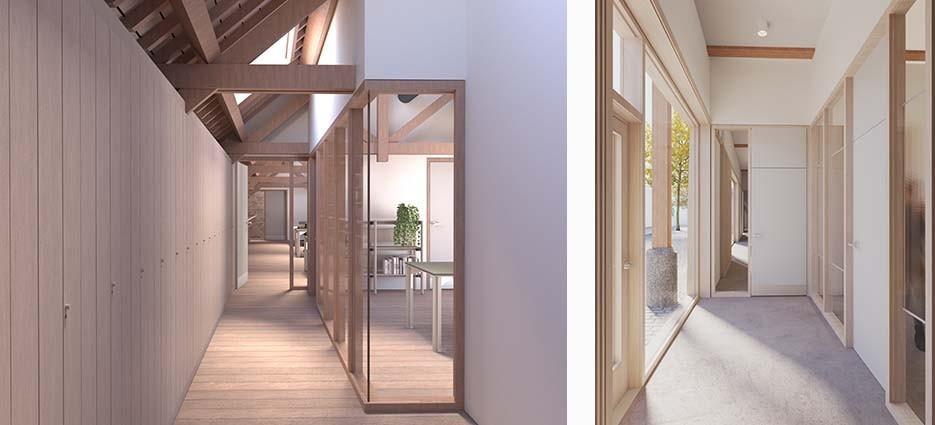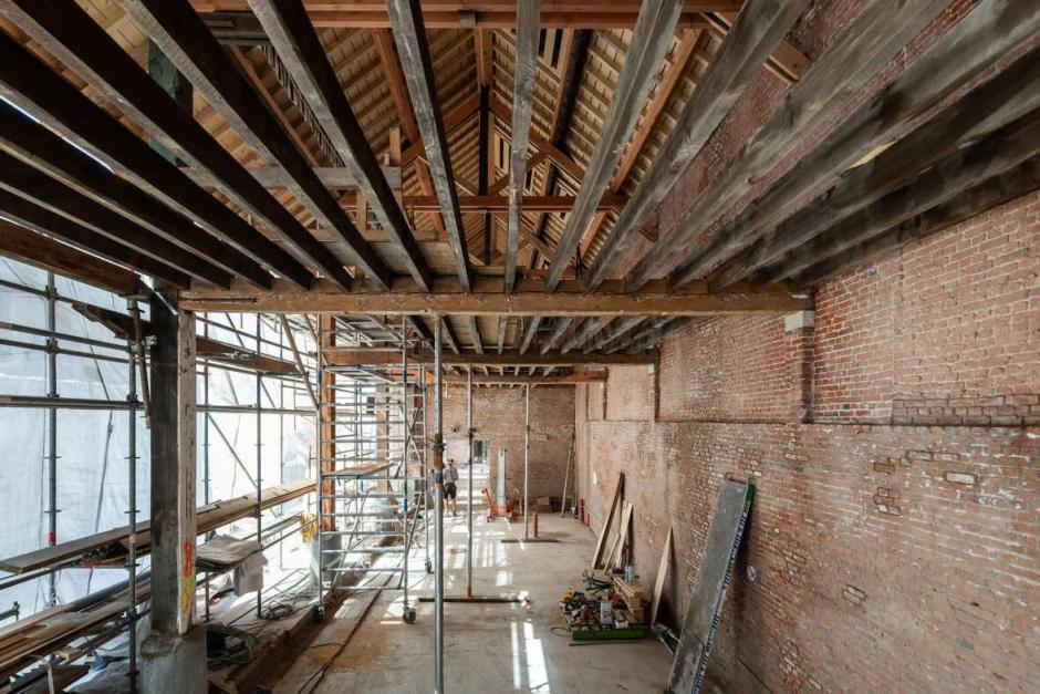 De draagstructuur van de pakhuizen wordt eerst gestabiliseerd en hersteld, waarna de gebouwen weer- en winddicht worden gemaakt. Tegelijk worden nieuwe technieken en performante schiloplossingen ingewerkt om het complex bouwfysisch op te waarderen tot een volwaardig kantoorgebouw — zonder de grote overspanningen, zichtbare constructies en de typische magazijnlogica op te offeren. De open pakhuisdelen krijgen een nieuwe, terugspringende buitengevel, zodat hun open karakter voor de voorbijganger leesbaar blijft. Vensteropeningen en de historische kleurstelling worden daarbij maximaal gereconstrueerd.