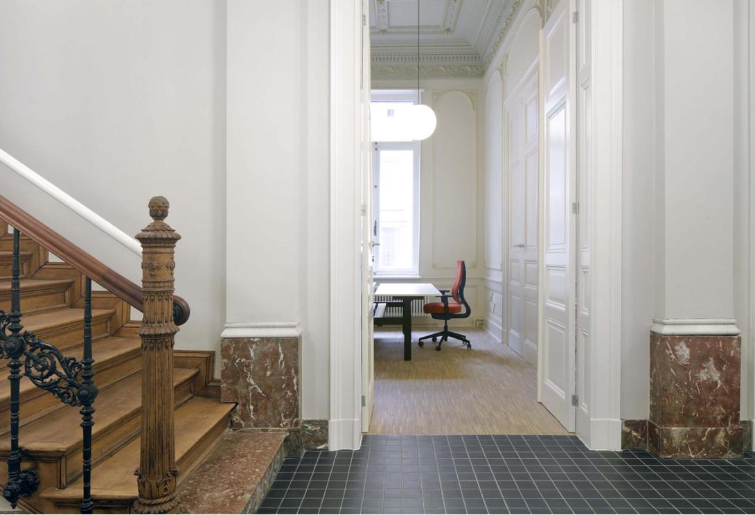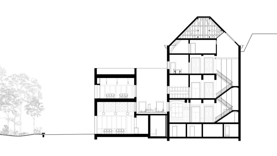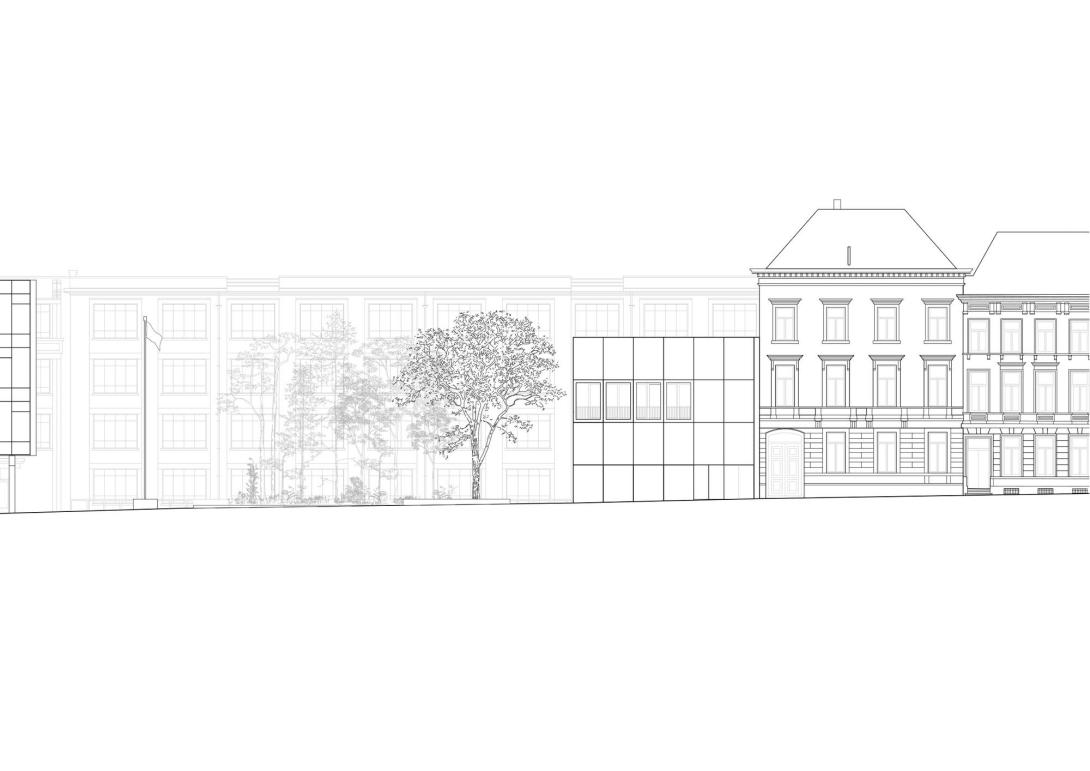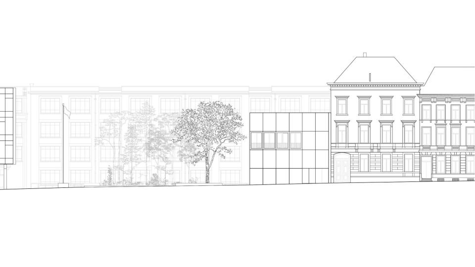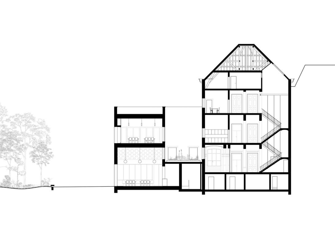 In een dicht stedelijk weefsel maakt het ontwerp een precieze afweging tussen wat behouden wordt en wat nieuw is. De oorspronkelijke Brug, lang ervaren als een grote achterbouw aan het herenhuis, werd herschikt door een nieuw volume dat het ensemble ordent en de historische geleding van de straat herwaardeert. De gevel van de uitbreiding sluit aan bij de buren via schaal en ritmering, maar laat via materialiteit en detaillering toch een discretie in tijd zien.