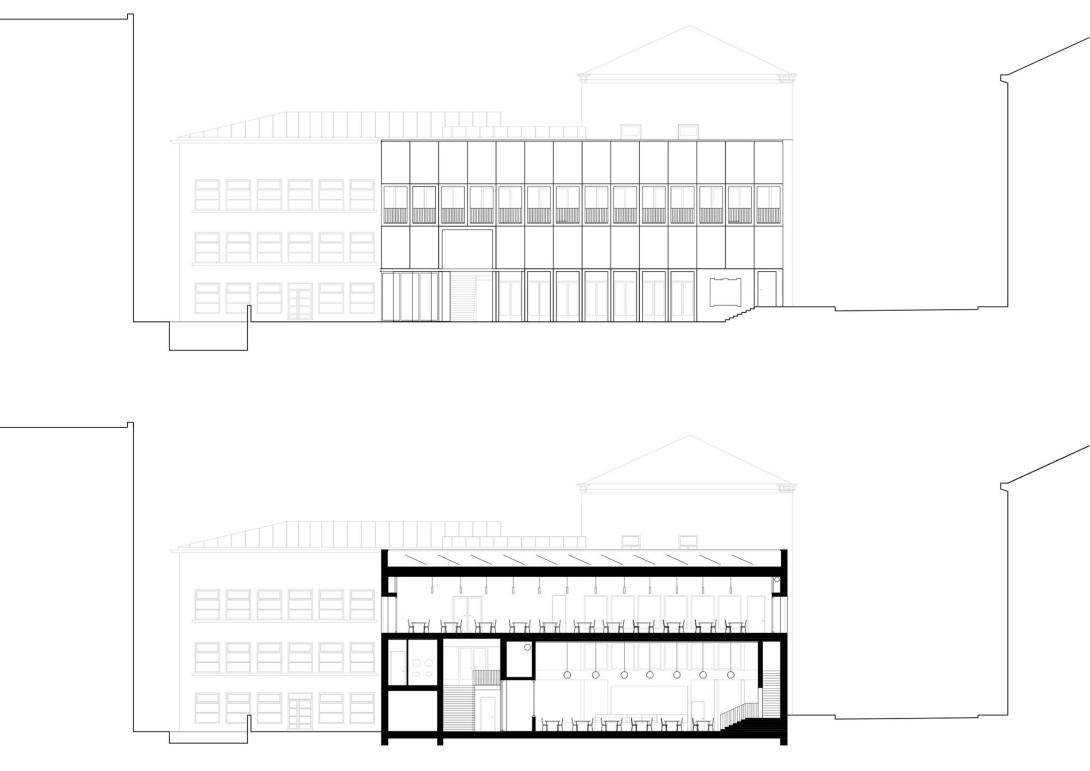 De nieuwe uitbreiding is strategisch naar het studentenplein georiënteerd en fungeert als publieke ingang en spil. Op het gelijkvloers opent de cafetaria volledig naar het plein, terwijl de verdieping als open, flexibel in te richten ruimte fungeert, bruikbaar als restaurant, studieruimte of auditorium. Daarmee vertaalt het ontwerp de traditionele refterlogica naar een eigentijds campusprogramma waarin eten, studeren en ontmoeten in elkaar overvloeien.