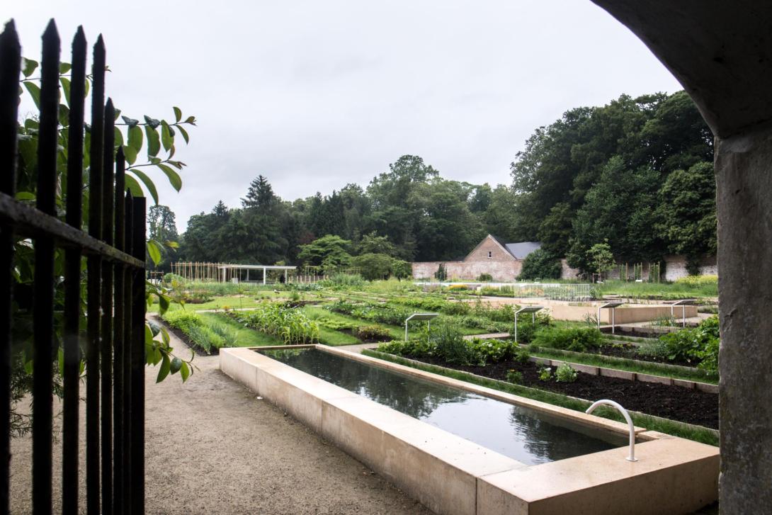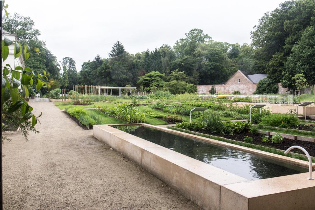 “Daar ontwierpen we een culinaire belevingstuin waarin scholen, bedrijven, senioren, families … de herkomst ontdekken van de plaatselijke groenten, fruit en kruiden. Door het niveau centraal omhoog te brengen, verviel de drempel tussen binnen en buiten. We herstelden er ook de natuurlijke helling en werkten alle bovenzijden van de kweekvakken op gelijk niveau uit. Zo ontstonden bakken die uit de helling komen. Evenals een gravitaire afwatering die uitmondt in verschillende waterbassins.”