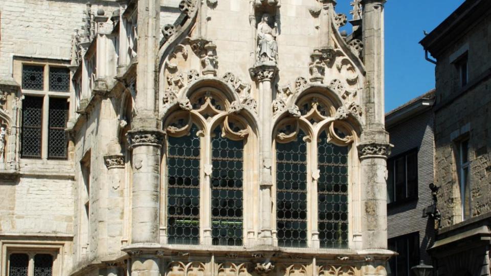De buitenrestauratie werd opgesplitst in twee fases, omwille van de zichtbaarheid van het gebouw aan de Grote Markt en de drukke evenementenkalender van Aalst Carnaval en kerstmarkt. Het einde van de buitenwerken is voorzien tegen de zomer van 2026. Op het programma van de exterieurfase: de restauratie van dak en gevels, in aansluiting op een vorige campagnefase waarin buitenschrijnwerk, glas-in-loodramen en schilderwerken al deels werden aangepakt. Daarnaast werden de glas-in-loodramen en dakkapellen gerestaureerd. Bijzondere aandacht ging naar de natuurstenen gevelelementen: Lediaanse steen, zandstenen kruiskozijnen, geprofileerde omlijstingen en de gotische nissen aan de belforttoren met de beelden van de Graaf van Vlaanderen en de Heer van Aalst. De uitdaging voor de restauratiearchitect was dubbel: enerzijds het herstel van laatmiddeleeuws metsel- en steensnijwerk, anderzijds het kritisch beoordelen van het 19de-eeuwse Van Assche-werk — onder meer de toegevoegde noordwestelijke traptoren — als volwaardig erfgoed dat op zijn beurt om conservering vraagt.