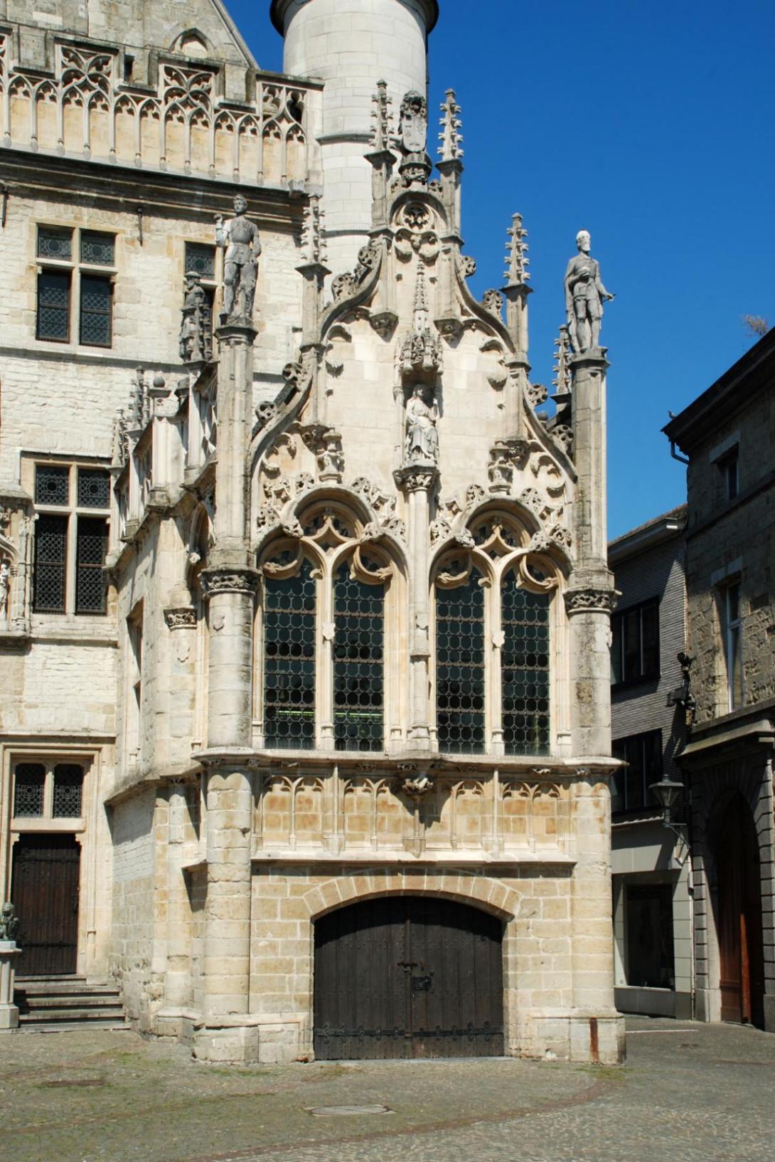 Voor de restaurateur is vooral de materiaaltechnische gelaagdheid relevant. Lediaanse steen domineert in oost- en noordgevel, in de deels ingebouwde belforttoren en in het gebiedshuisje. De kruiskozijnen en tweelichten van west- en zuidgevel hebben zandstenen negblokken, met geprofileerde zandstenen omlijstingen rond de deuren. Boven het schepenhuis ligt een leien zadeldak met houten klokkenruiter; de belforttoren wordt bekroond door een achtzijdige campanile onder naaldspits, de ronde traptorens dragen kegelspitsen. Binnen verdienen de hallenkelder met kruisribgewelven en de stergewelven van het gebiedshuisje bijzondere aandacht.