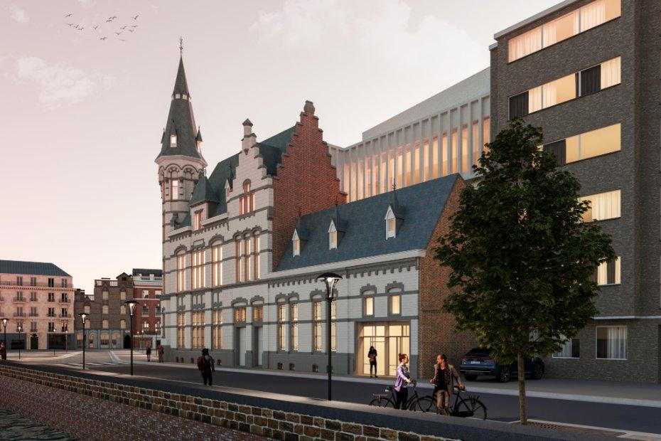 Om het gebouw te laten aansluiten bij hedendaagse noden, wordt achter de oorspronkelijke vleugels een nieuw volume toegevoegd. Dit transparante en lichte gedeelte creëert extra doorzichten en zorgt voor voldoende daglicht in de binnenruimtes. Het gebruik van witte baksteen en verticale betonelementen sluit visueel aan bij de historische gevels, waardoor oud en nieuw in harmonie samengaan. Het resultaat is een gebouw dat zowel zijn erfgoedwaarde behoudt als ruimte biedt voor flexibele, multifunctionele invullingen.