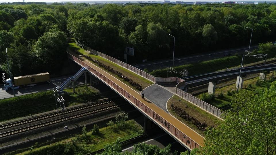 De Vlaamse Landmaatschappij (VLM) en partners transformeerden de Ravaartstraat tot een groene oase. 8.000 m² asfalt maakte plaats voor natuur, water en zachte mobiliteit. De bermbrug over de E19 herstelt de ecologische verbinding en toont hoe de VLM inzet op klimaatbestendige publieke ruimte.