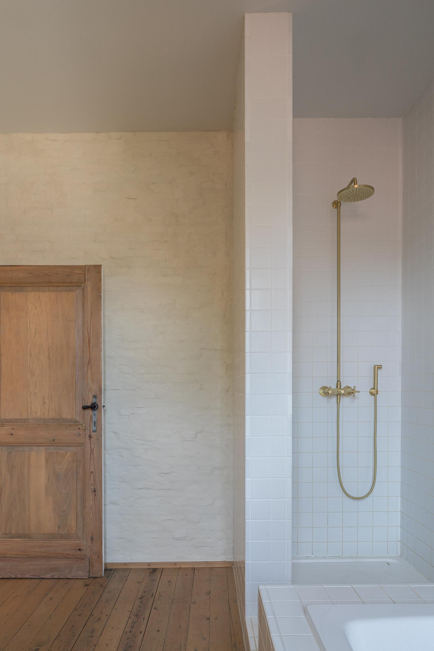 Ook kozen de architecten er bewust voor de indeling en de verticale circulatie van de woning te vrijwaren zodat zo weinig mogelijk moest worden opengebroken. Het tweede devies voor de interne renovatie: zorgen dat nieuwe materialen daar waar het kan biogebaseerd zijn. Zo werd bij de opbouw van de vloer van het gelijkvloers geen gebruik gemaakt van beton maar wel van schelpen die ook akoestisch en thermisch isolerend werken.