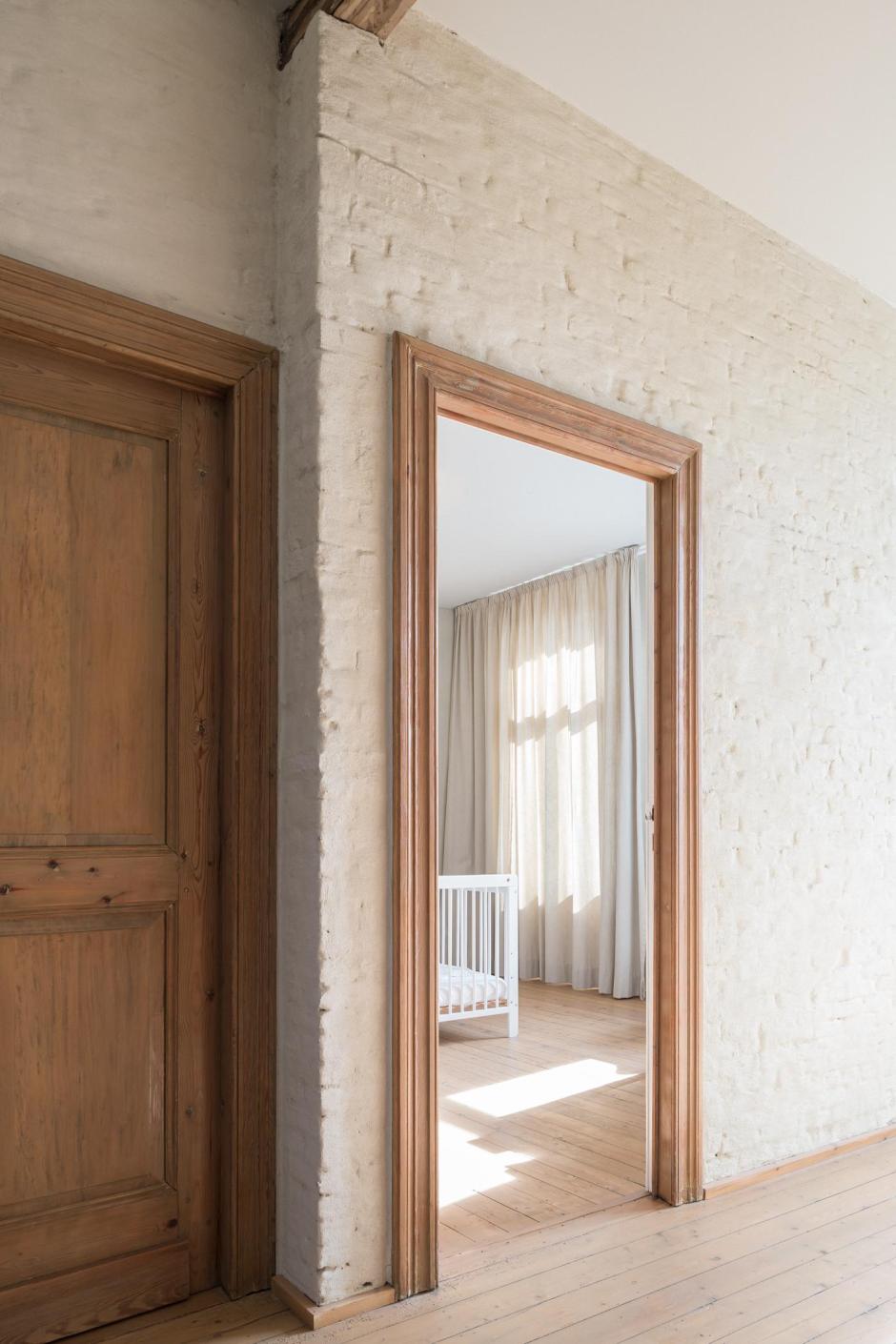 De binnenmuren werden ruw gezet tot op de naakte baksteen, opnieuw gevoegd en gekaleid met leempleister en afgewerkt met leemverf. De andere technieken dan die voor de wandverwarming werden in opbouw op de muren geplaatst, zodat ze goed bereikbaar blijven voor onderhoud, herstellingen en eventuele aanpassingen. Omdat de vloeren behouden bleven, werd om het vloerpakket te isoleren geopteerd om de plafonds open te werken, te isoleren en af te werken met Fermacell-platen, gemaakt van gips- en papiervezels afkomstig van gerecycleerde materialen.