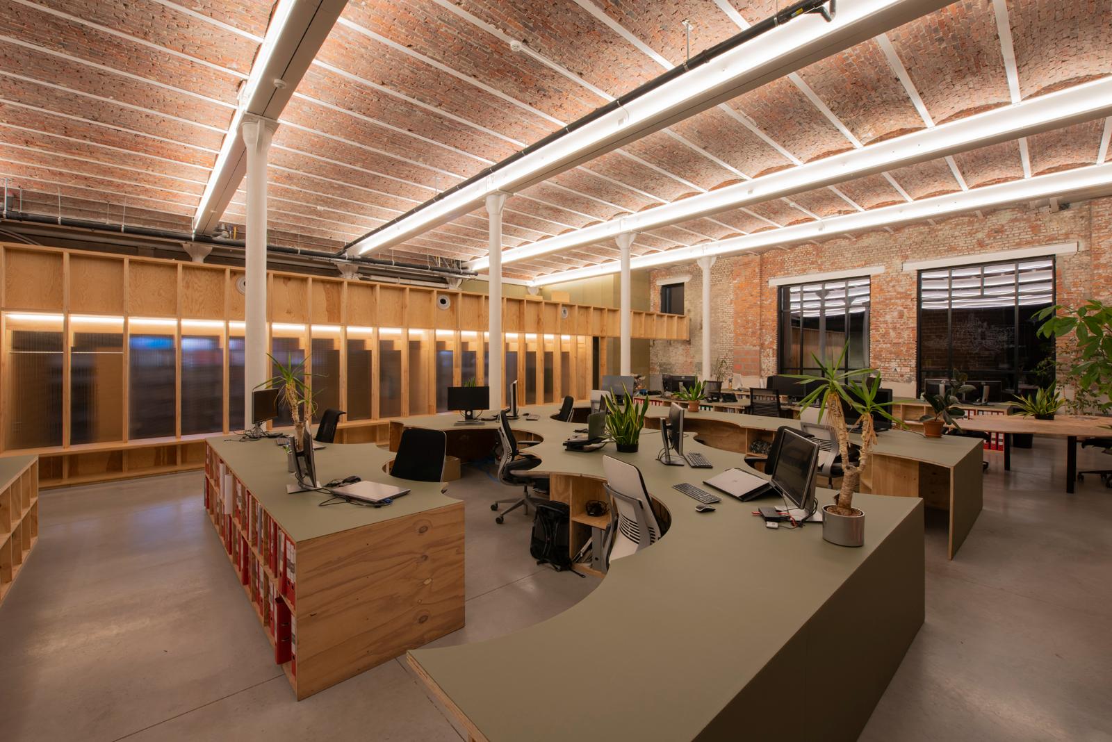 Om de charme van het pand maximaal uit te spelen, koos het architectenteam voor een modulaire en circulaire invulling. Een volume met mezzanine plaatsten ze vrij in de ruimte. Op die manier creëerden ze 60 m2 extra, goed voor twee vergaderzalen, een sanitaire kern, kitchenette en ruimte voor de printers en plotter.