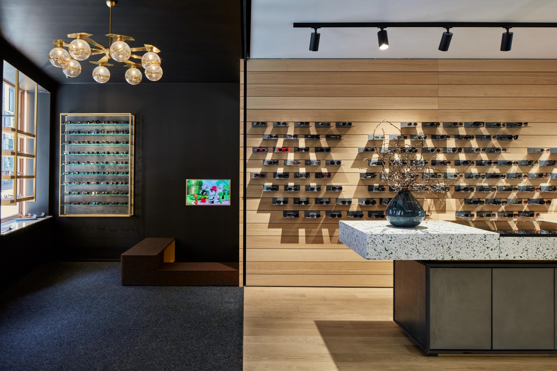 In de toonzaal werd er maximale bergruimte voorzien met lange kastenwanden. De individuele aanpak van de familie Van Lindt werd versterkt door de aparte consultatieruimtes voor de klanten. Terwijl het atelier een overzicht geeft over de totale winkel en deze toch de connectie maakt via de zwarte staalramen. Warmgewalste en zwarte staalelementen geven het geheel een industriële look die verder wordt doorgetrokken tot een op maat gemaakt gekreukte betonblok aan de kassa. Dit wordt afgewisseld met zachte elementen in vilt en messingelementen die tot in de verlichting verweven zitten. Ook de werkbladen en op maat gemaakte tafel kregen een persoonlijke link met de optiekwinkel door het gebruik van glaselementen in de terrazzowerkbladen.